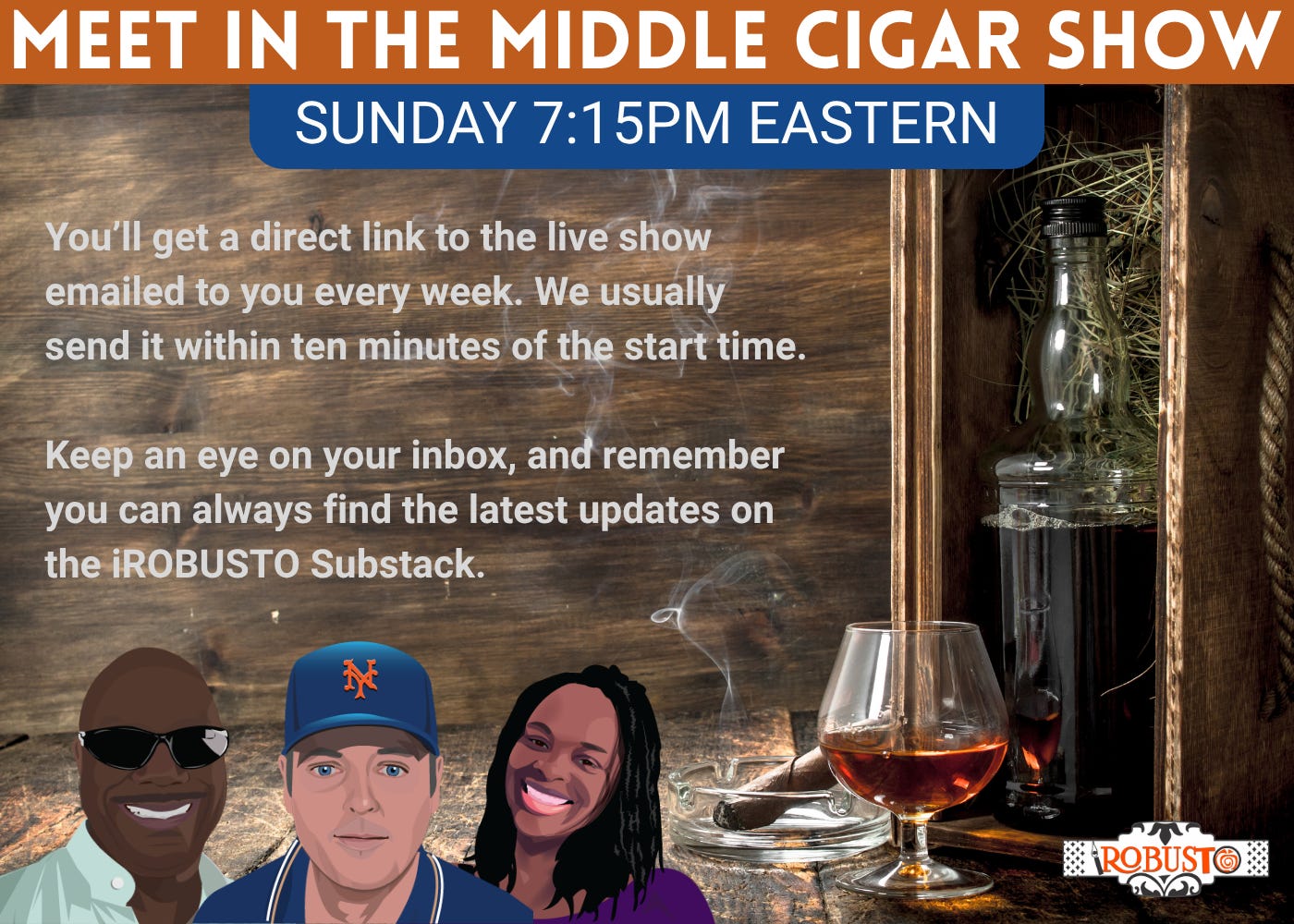 You can also go to iROBUSTO.COM right around 7:15 PM Eastern on Sunday. The Meet in the Middle Cigar Show will be live right on the home page.